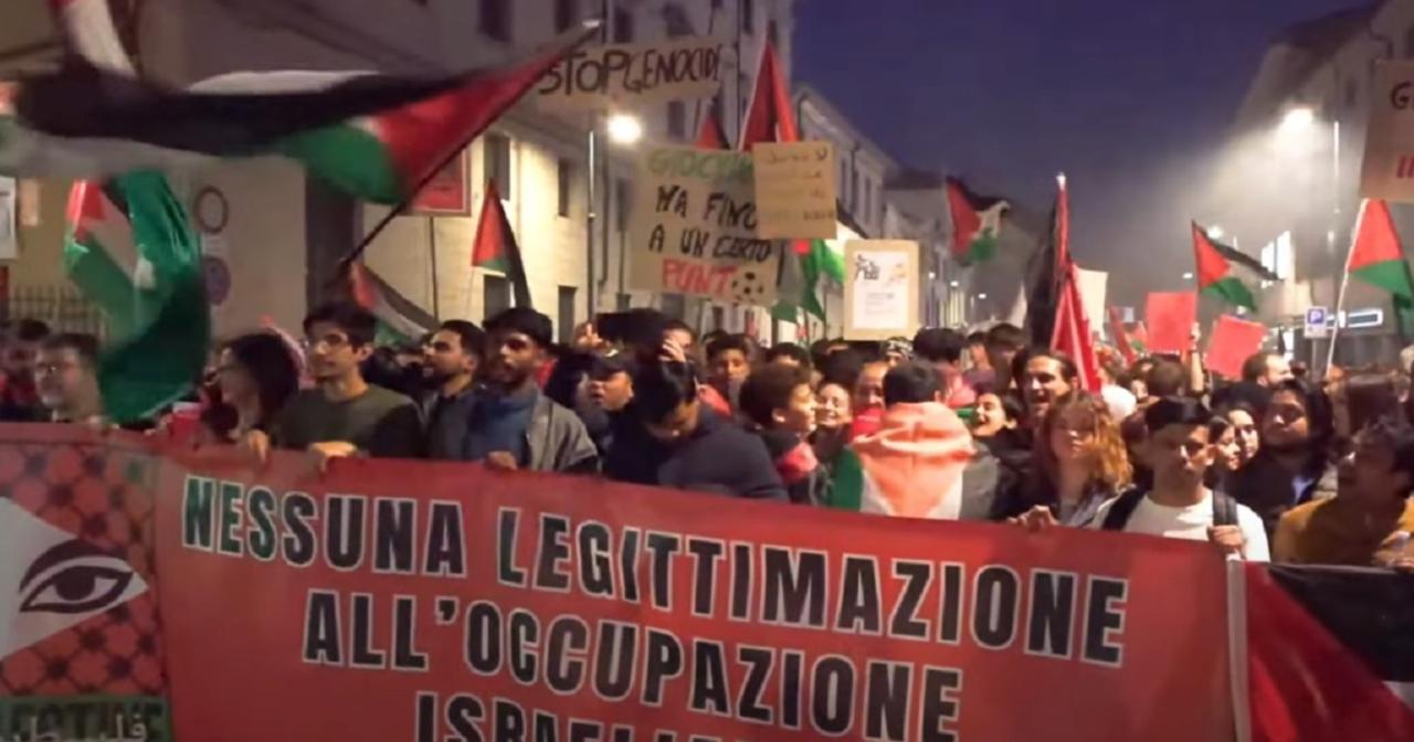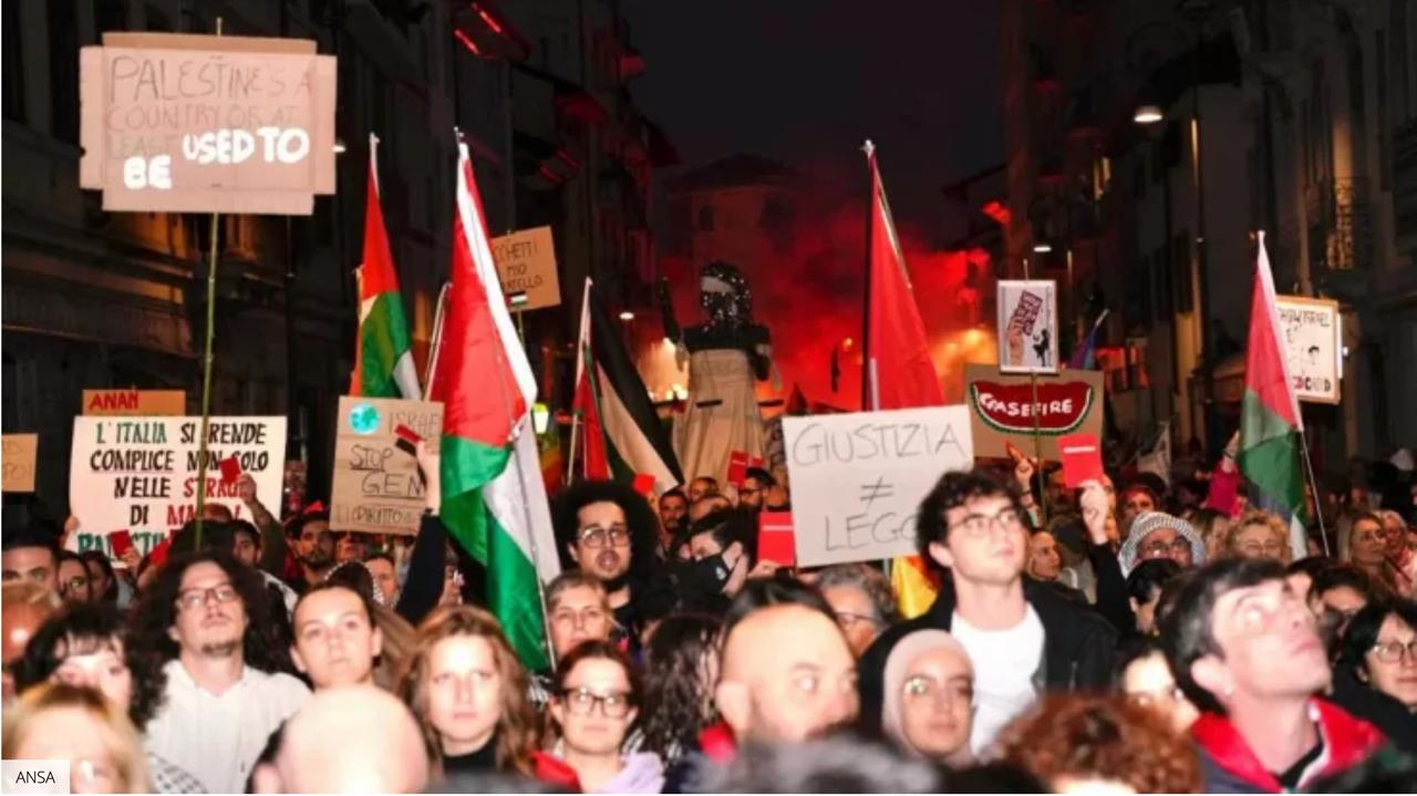 «Нельзя играть против тех, кто представляет государство геноцида и апартеида, такое как Израиль», – под этим лозунгом началось шествие, стартовавшее с Пьяцца делла Репубблика.