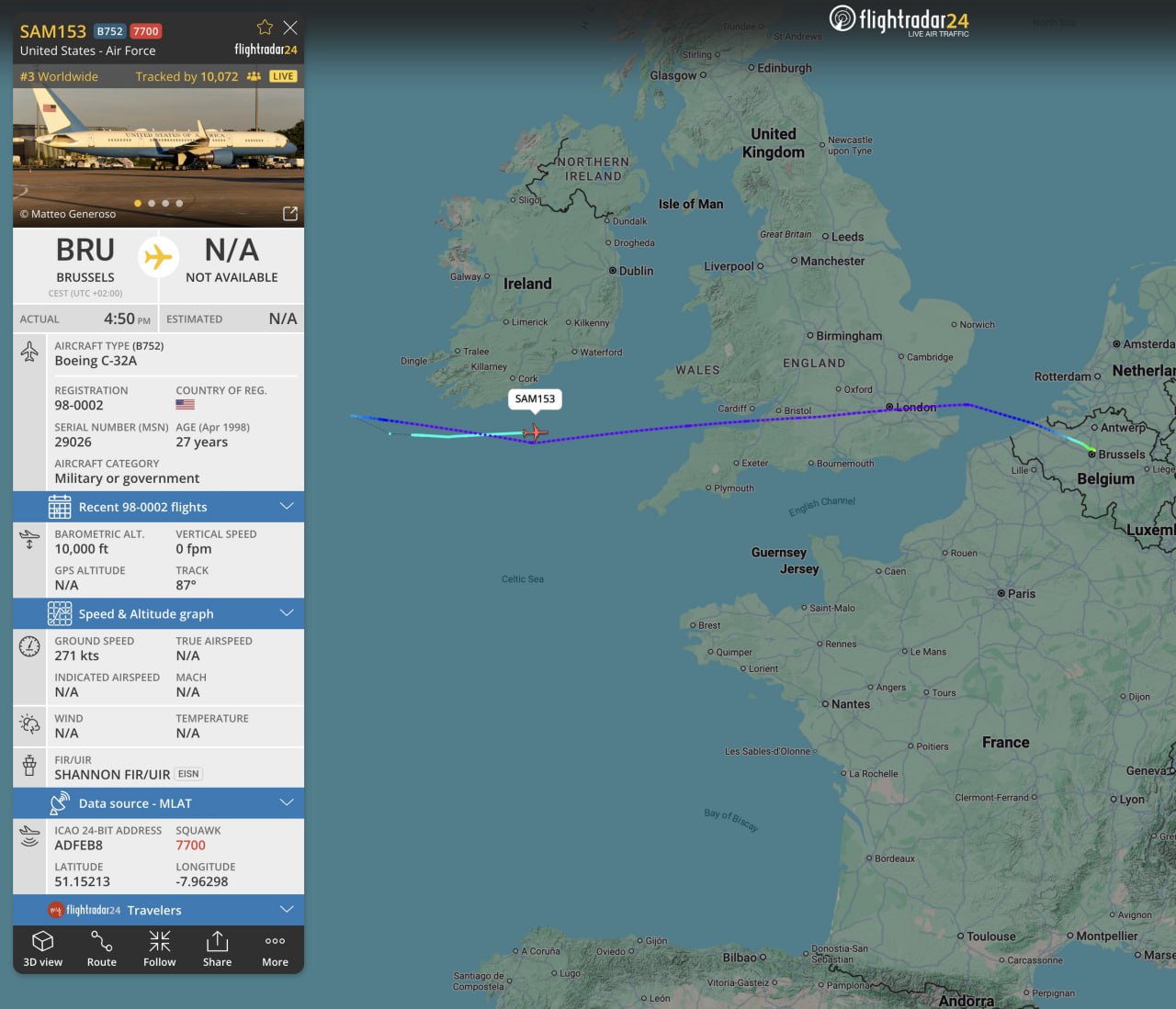 Журналист Эндрю Лейден, который следил за полётом главы Пентагона на SAM153 через специализированные платформы, сообщил в X, что самолёт вылетел из Бельгии, где сегодня принимал участие в министерской встрече НАТО и заседании контактной группы «Рамштайн», а затем развернулся над Атлантическим океаном, подав сигнал 7700 (это международный сигнал чрезвычайной ситуации).