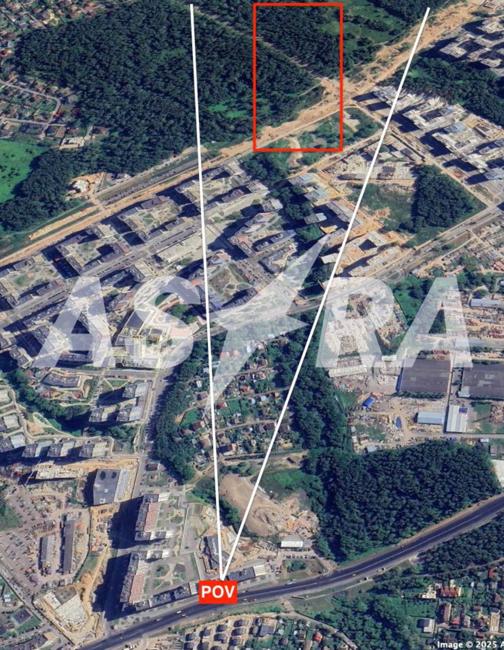 ASTRA геолоцировала кадры — они действительно сняты в Коммунарке, дым виден в районе лесного массива, прилегающего к Проектируемому проезду